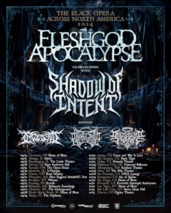 O FLESHGOD APOCALYPSE anunciou recentemente seu retorno à América do Norte apoiando o iminente lançamento de seu novo álbum com uma turnê conjunta com o SHADOW OF INTENT, e as bandas de abertura INGESTED, THE ZENITH PASSAGE e DISEMBODIED TYRANT, que começa no dia 14 de setembro em Cleveland, OH e termina no dia 15 de outubro em Denver, CO.