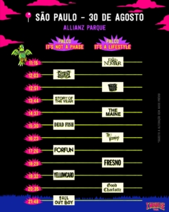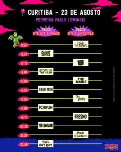 A segunda edição da I Wanna Be Tour proporcionará um dia repleto de shows. Serão mais de 20 atrações que farão o emo e o pop-punk ecoar por Curitiba, na Pedreira Paulo Leminski; e por São Paulo, no Allianz Parque, locais que receberão o evento nos dias 23 de agosto e 30 de agosto, respectivamente. Para que o público possa se programar para montar o seu cronograma dos sonhos, a IWBT antecipa os horários em que as bandas, que estarão divididas entre os palcos It’s Not a Phase e It’s a Lifestyle, irão se apresentar. Os brasileiros do Fake Number e do Gloria abrem a série de espetáculos em ambas ocasiões, enquanto o Good Charlotte e o Fall Out Boy são responsáveis por encerrar o roteiro. A IWBT é uma realização da 30e, maior companhia brasileira de entretenimento ao vivo, e tem patrocínio da Vans. Ainda há ingressos disponíveis para as duas edições pelo site da Eventim (acesse aqui).