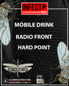 Na primeira edição, que acontece dia 20/10 no Calabouço Rock Bar, o INFEST ROCK terá a honra de receber as bandas Hard Point (@hardpoint_oficial), Radio Front (@radiofront) e Móbile Drink (@mobiledrinkoficial).