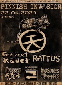 Duas das mais influentes bandas do hardcore/punk finlandês, farão uma turnê histórica por aqui em abril; as lendárias bandas Terveet Kädet e Rattus já têm 9 datas confirmadas em sua “Finish Invasion Tour”. Será a primeira e última tour das duas bandas juntas. Ou seja, o que era quase impensável, acontece no Brasil, com as duas apresentando seus clássicos no mesmo palco.