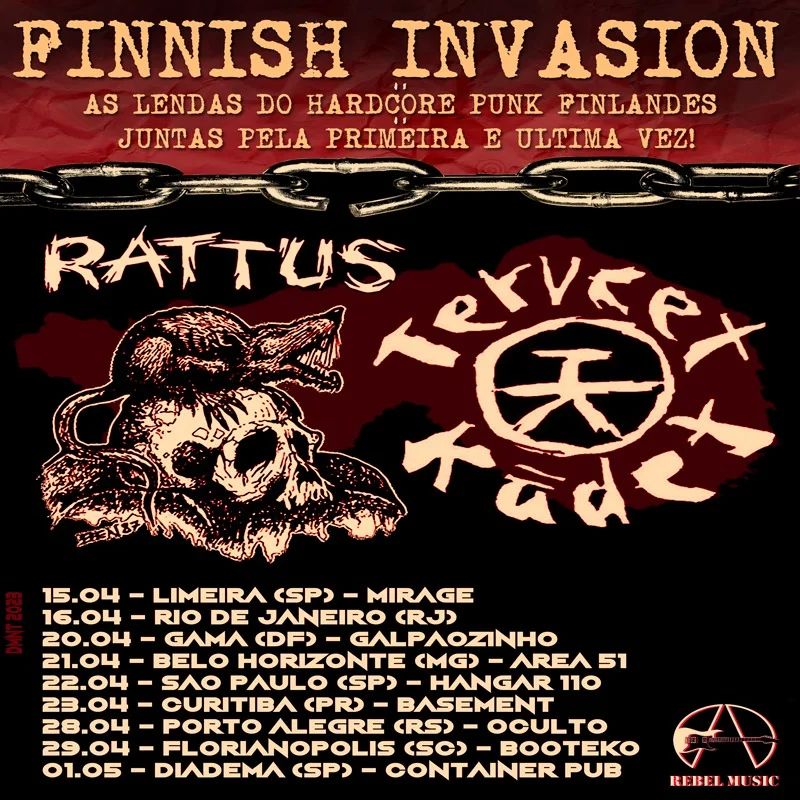 Duas das mais influentes bandas do hardcore/punk finlandês, farão uma turnê histórica por aqui em abril; as lendárias bandas Terveet Kädet e Rattus já têm 9 datas confirmadas em sua “Finish Invasion Tour”. Será a primeira e última tour das duas bandas juntas. Ou seja, o que era quase impensável, acontece no Brasil, com as duas apresentando seus clássicos no mesmo palco.