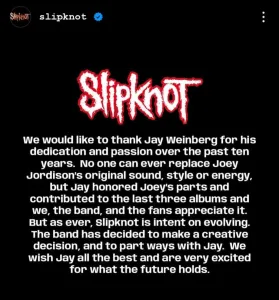 ““Nós gostaríamos de agradecer a Jay Weinberg por sua dedicação e paixão neste anos. Ninguém poderia substituir Joey Jordison, seu som, sua energia ou estilo, mas Jay honrou as partes de Joey e contribuiu nos últimos três álbuns, e nós e os fãs apreciamos isso. Mas como sempre, o Slipknot tem intenção de evoluir. E devido a uma decisão criativa, a banda decidiu se separar de Jay. Nós desejamos a Jay o melhor e estamos excitados para o que o futuro nos guarda”.