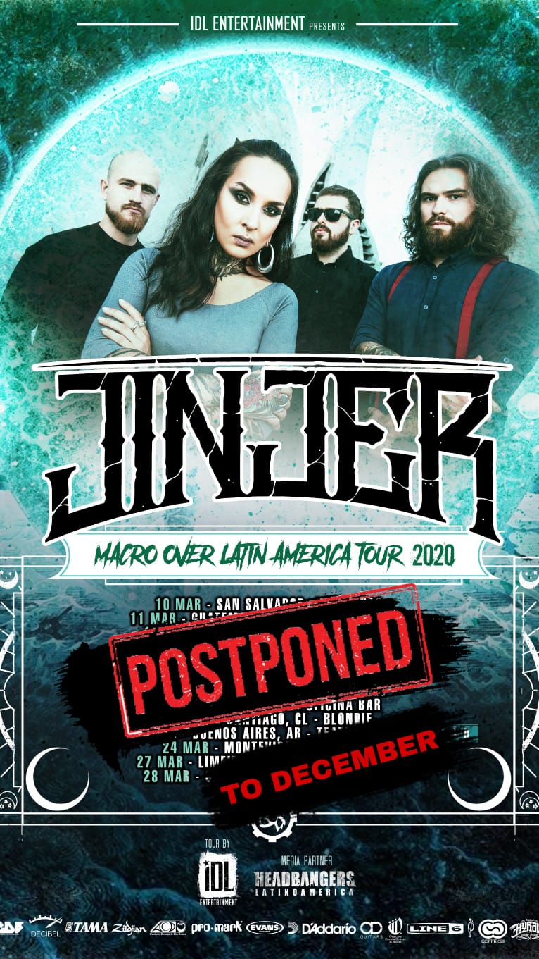 “Queridos amigos, é com muito pesar que anunciamos o adiamento de nossa atual turnê pela América Latina para dezembro de 2020. Este tsunami do COVID-19 tem nos perseguindo nas últimas semanas e finalmente chegou ao fim. Fizemos o possível para salvar a turnê, mas as situações locais estão muito além do nosso controle. Além disso, definitivamente nós não queremos arriscar a saúde de nossos fãs nem de nós mesmos por mais tempo. Na situação atual, todos precisamos permanecer unidos, mas o mais importante é que NÃO devemos entrar em pânico e manter a calma. Por favor, tome todas as precauções para não serem infectados e, esperançosamente, nossa música os manteram de bom humor até que isso tudo passe. Estamos ansiosos para voltar ao seu incrível continente em breve para oferecer o JINJER que todos vocês merecem! FIQUEM SEGUROS!!