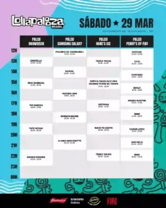 O Lollapalooza Brasil disponibilizou hoje no seu aplicativo oficial os horários dos shows de todos os palcos. Nos dias 28, 29 e 30 de março, o público terá acesso a mais de 70 apresentações. Por meio do app, será possível montar seu calendário pessoal de shows e ter acesso a todas as informações da 12ª edição brasileira do festival, que preenche os 600 mil m² do Autódromo de Interlagos com música de qualidade e momentos que marcam gerações.