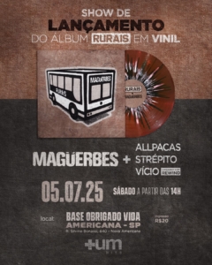Rurais, o mais recente álbum do Magüerbes, ganha versão em vinil 12” splatter (cores mescladas) e capa revisada por meio do selo e produtora +um Hits (@maisumhits). O show de lançamento do material, cuja primeira prensagem conta com 150 cópias, acontece neste sábado (5/07), no Base Obrigado Vida, em Americana/SP.