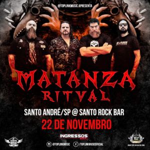 O Matanza Ritual, grupo que mantém viva a essência do lendário Matanza com peso absoluto e nova energia, confirma duas apresentações imperdíveis em novembro no estado de São Paulo. No dia 21 de novembro (sexta-feira), a banda sobe ao palco do Carioca Club, em Pinheiros, São Paulo, e no dia seguinte, 22 de novembro (sábado), se apresenta no Santo Rock Bar, em Santo André. Os shows são da Top Link Music.