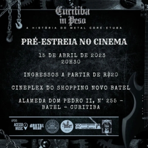 Após dois anos de muito trabalho e gravações, finalmente chega aos cinemas o documentário Curitiba In Peso – A História do Metal Coré-Etuba. O filme, com mais de três horas de duração, reúne dezenas de personagens importantes desse cenário musical, resgatando histórias dos primórdios do estilo, dos anos 1980, passando pelas décadas seguintes e traçando um amplo panorama do Metal na capital paranaense.