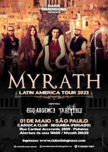 A Produtora Dark Dimensions, responsável pela turnê latino-americana da banda Myrath, infelizmente adiada para final do mês de abril e início de maio de 2023 por conta de problemas de vistos.