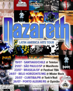 O Nazareth, um dos grupos mais emblemáticos do rock mundial, volta ao Brasil em julho de 2026 para comemorar mais de 55 anos de carreira em uma turnê dedicada aos seus maiores sucessos. A Top Link Music confirmou em suas redes sociais as datas da Latin America Hits Tour, que terá passagens por cinco cidades brasileiras. Os ingressos estarão à venda em breve – para mais informações siga os perfis da Top Link Music.