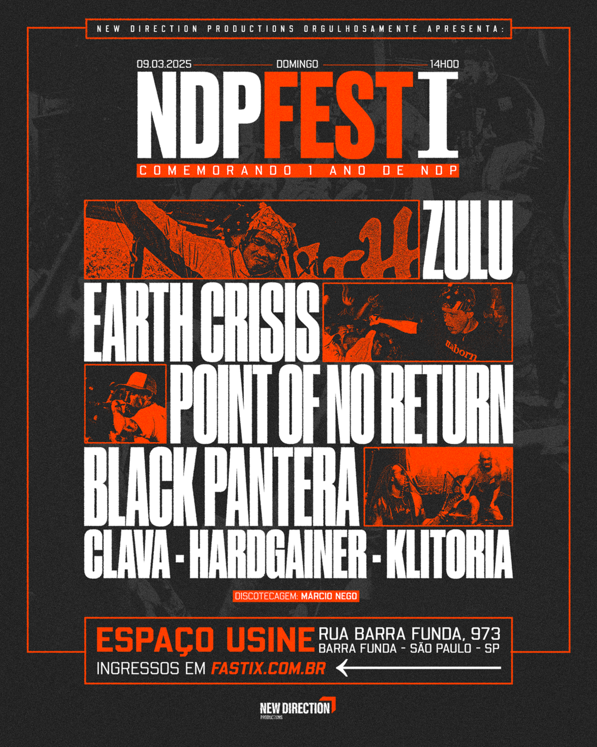 A New Direction Productions, que estreou em 2024 com marcantes turnês (Angel Du$t, Suicial Tendencies, Joyce Manor, Gorilla Biscuits e Shelter), e já tem uma impressionante lista de shows para 2025, celebra 1 anos de atividades neste domingo (9/03, no Espaço Usine) no 1º NDP Fest. A icônica Earth Crisis e a sensação do hardcore Zulu são as atrações principais.