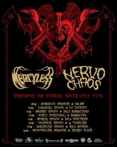 O NervoChaos aproveitou sua nova formação para anunciar a tour “Spreading the Eternal Death Cult”, com oito noites de pura brutalidade e caos espalhados pela França, Espanha e Portugal, ao lado dos franceses da banda Mercyless.