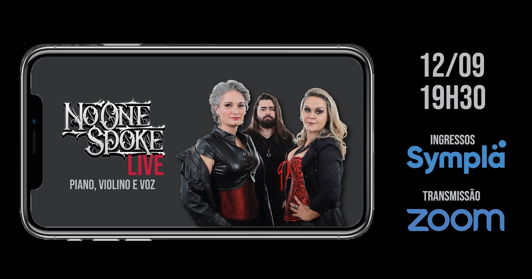 Dia 12 de setembro, 19:30h, Carla Domingues (voz), Iva Giracca (violino) e Thiago Gonçalves (piano), apresentam-se ao vivo via ZOOM, interpretando músicas autorais da NO ONE SPOKE e também versões acústicas para músicas de bandas como Epica, Nightwish, Within Temptation, Evanescence e outros nomes expoentes da música metal. A live é uma das ações da banda para ampliar a campanha de financiamento coletivo que está ativa para viabilizar a gravação de seu primeiro álbum. Para adquirir o ingresso para a live basta acessar o site da Sympla https://www.sympla.com.br/noonespoke-live—piano-violino-e-voz__964155
