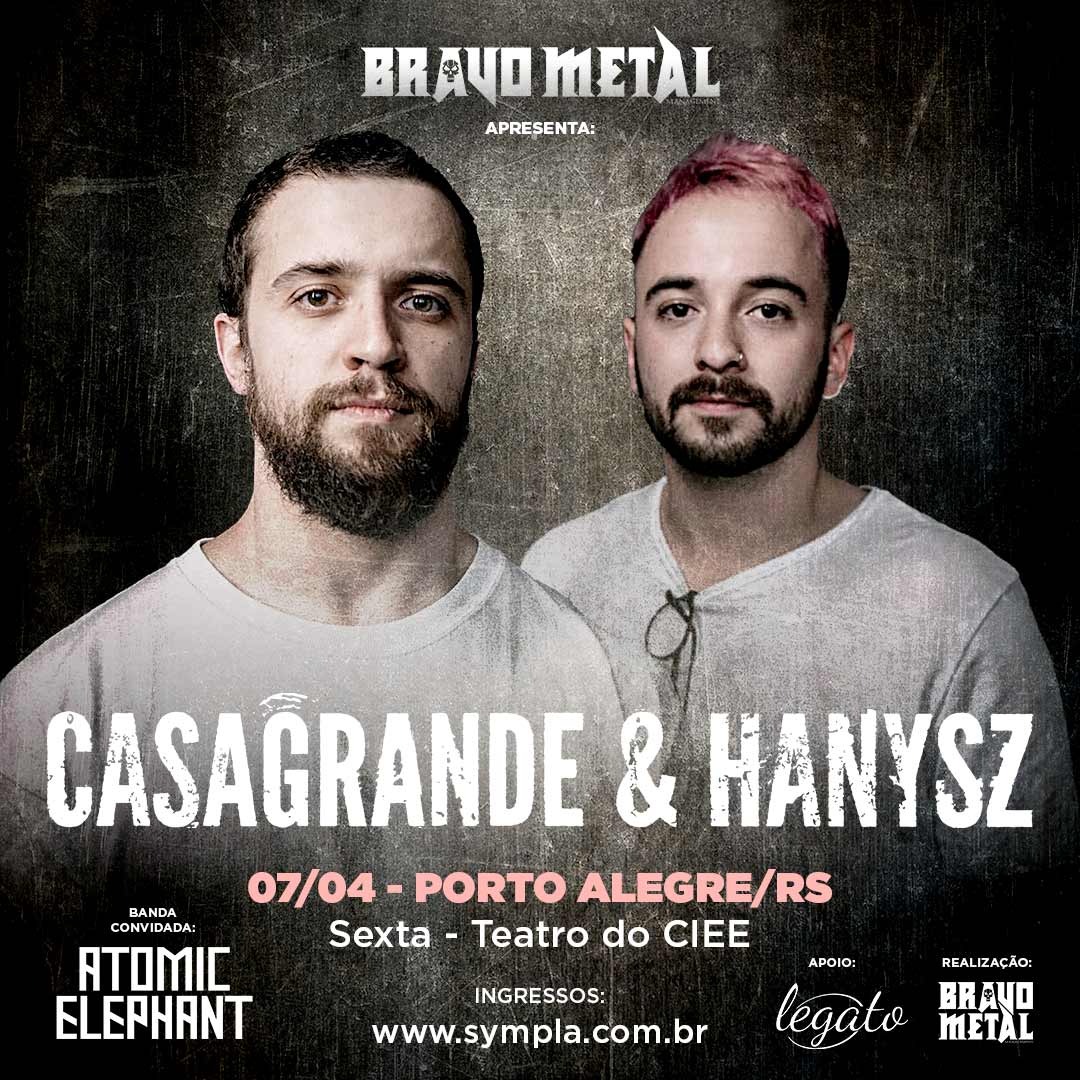 A produtora BRAVO METAL MGMT anuncia seu próximo evento na capital gaúcha, levando ao palco do Teatro do CIEE o novo projeto do baterista do Sepultura, Eloy Casagrande, chamado CASAGRANDE & HANYSZ, em show que será realizado no dia 07/04. O CASAGRANDE & HANYSZ foi formado recentemente por Eloy em parceria com o guitarrista João Hanysz, apresentando sons experimentais que trazem influência de vivências e sonhos, que numa simbiose acabam confundindo o ouvinte do que é real ou imaginado, englobando música brasileira com toques de Metal extremo e Rock Progressivo com influência de videogame.