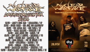 A banda alemã de thrash metal Nuclear Warfare, que conta com Fritz (vocal e baixo), Listl (guitarra) e o baterista brasileiro Alexandre “Xandão” Brito (Andralls), fará uma tour de 12 datas pelo Brasil, com início no próximo domingo (25) em Indaiatuba (SP). “Está será a quarta tour da banda pelo Brasil, mas será a primeira na região Sul. Serão 12 datas que irão passar pelos Estados de São Paulo, Paraná e finalizando no festival ‘Otacílio Rock Fest’, em Santa Catarina”, revelou Xandão Brito, que está há dez anos com a banda.