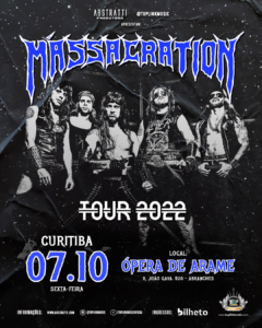 Um dia antes, 07 de outubro, no palco da Ópera de Arame, os “deuses do metal” retornam a cidade para mais um show cheio de riffs de guitarra, vocais agudos e muito bom humor. O Massacration, banda criada pelo grupo Hermes e Renato, apresentará músicas dos álbuns Gates of Metal Fried Chicken of Death (2005) e Good Blood Headbangers (2009), além dos mais recentes singles que obtiveram grande sucesso junto ao público, como os impagáveis “Metal Milf”, “Motormetal” e “Metal Galera”. Os convites podem ser adquiridos na plataforma Bilheto.