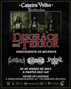 Promovendo o seu quinto álbum de estúdio, “Casa Nefanda” (2021), com shows pelo Brasil, Chile, Argentina e Uruguai, o power trio Disgrace and Terror atualmente conta com Rot (vocal e baixo), Vinicius Carvalho (guitarra) e Aldyr Rod (bateria). Criado em 2001 na cidade de Belém (PA), o trio mescla influências do death e thrash metal dos anos 80 e 90, tendo estreado com “Shadows of Violence” (2005), seguido por “The Final Sentence” (2013), “El Papa Negro” (2015) e “Age of Satan” (2018). Nestes 22 anos de atividades, realizou vários shows e festivais em todas as regiões do Brasil, além de turnês pela América do Sul e Europa, tocando ao lado de nomes como Cannibal Corpse, Malevolent Creation, Exodus, Destruction, Kreator, Belphegor, Aeon, Napalm Death, Enthroned, Onslaught, entre outros.