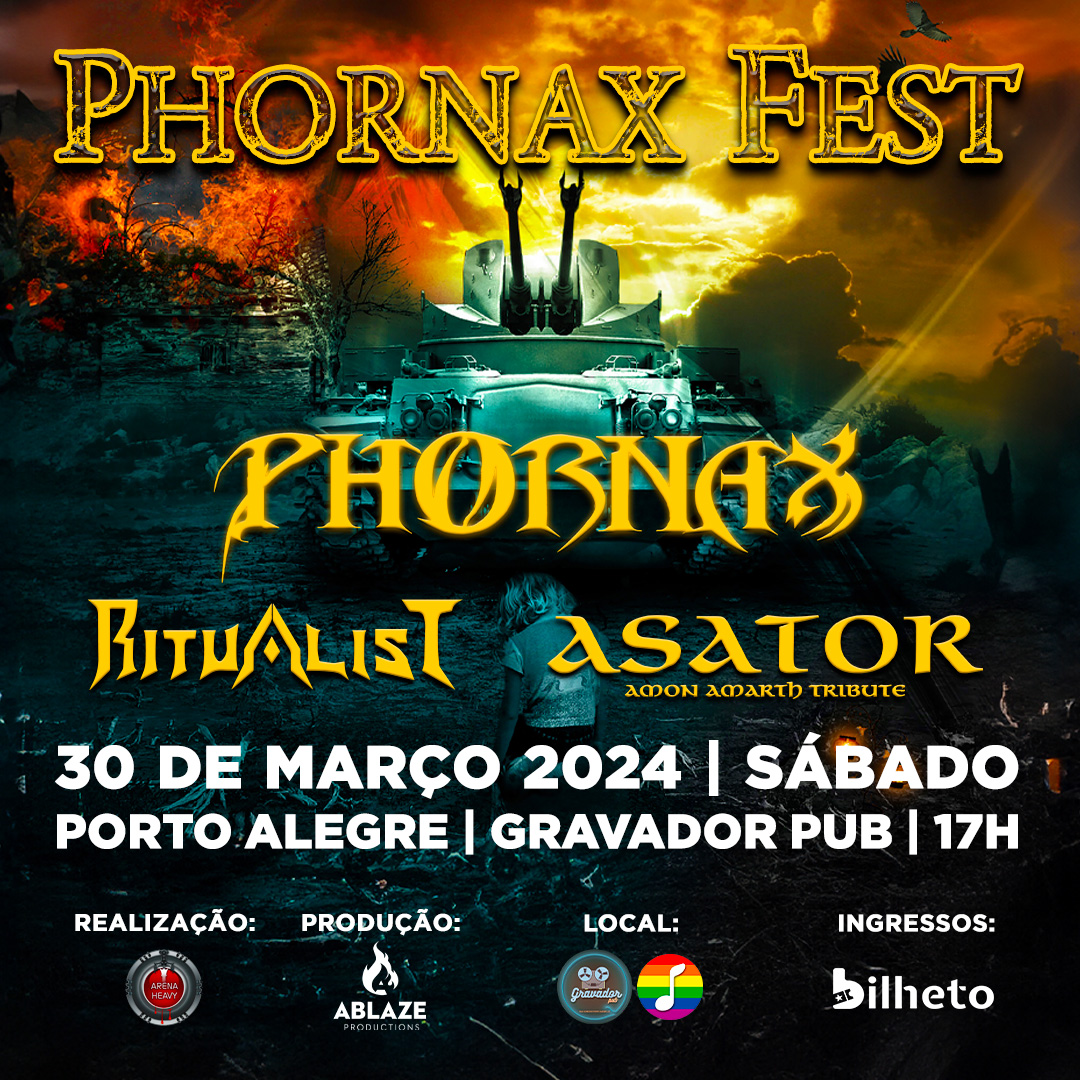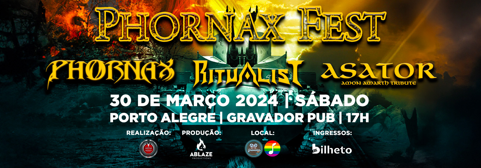 No próximo dia 30 de março, sábado, a cidade de Porto Alegre receberá a primeira edição do PHORNAX FEST, com produção da produtora ABLAZE PRODUCTIONS e do site ARENA HEAVY. Neste debut do evento tocará a banda anfitriã, PHORNAX, e as bandas RITUALIST e ASATOR (Amon Amarth Cover). Com ingressos custando entre R$ 20,00 e R$ 40,00, o PHORNAX FEST terá início às 17h, na tradicional casa de shows Gravador Pub. Para Cristiano Poschi, vocalista do PHORNAX e CEO do ARENA HEAVY, trata-se não apenas de um festival, mas sim de uma movimentação maior na cena metálica da região: “Estamos dando início à uma nova ação em nome do cenário local, abrindo espaço para bandas de diversos estilos. Queremos movimentar o Metal gaúcho e criar possibilidades para todos, levando ao público o que há de melhor dentro do Heavy, Power, Thrash, Death, etc. Para isso, contamos com o apoio de todos neste projeto!”.
