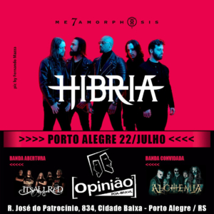 Promovendo o álbum “Me7amorphosis“, sétimo álbum da carreira do HIBRIA, Victor Emeka (vocal), Abel Camargo e Bruno Godinho (guitarras), Thiago Baumgarten (baixo) e Otávio Quiroga (bateria) se apresentarão no dia 22 de julho (sexta-feira), no Bar Opinião, em Porto Alegre (RS). O evento ainda contará com a presença das bandas It’s All Red (RS) e Alchemia (SP). A grande novidade será a participação especial de ex-integrantes da banda – Diego Kasper (guitarra), Benhur Lima (baixo), Renato Osorio (guitarra) e Marco Panichi (baixo) –, além do vocalista André Meyer (Distraught). “A volta do HIBRIA aos palcos está cada vez mais próxima e um time estrelado, formado por ex-membros da banda e por André Meyer (Distraught), estará com a gente! Vamos mandar as músicas novas do ‘Me7amorphosis’ e os grandes clássicos do HIBRIA. Será uma grande celebração que vai ficar na história“, apontou Abel Camargo.