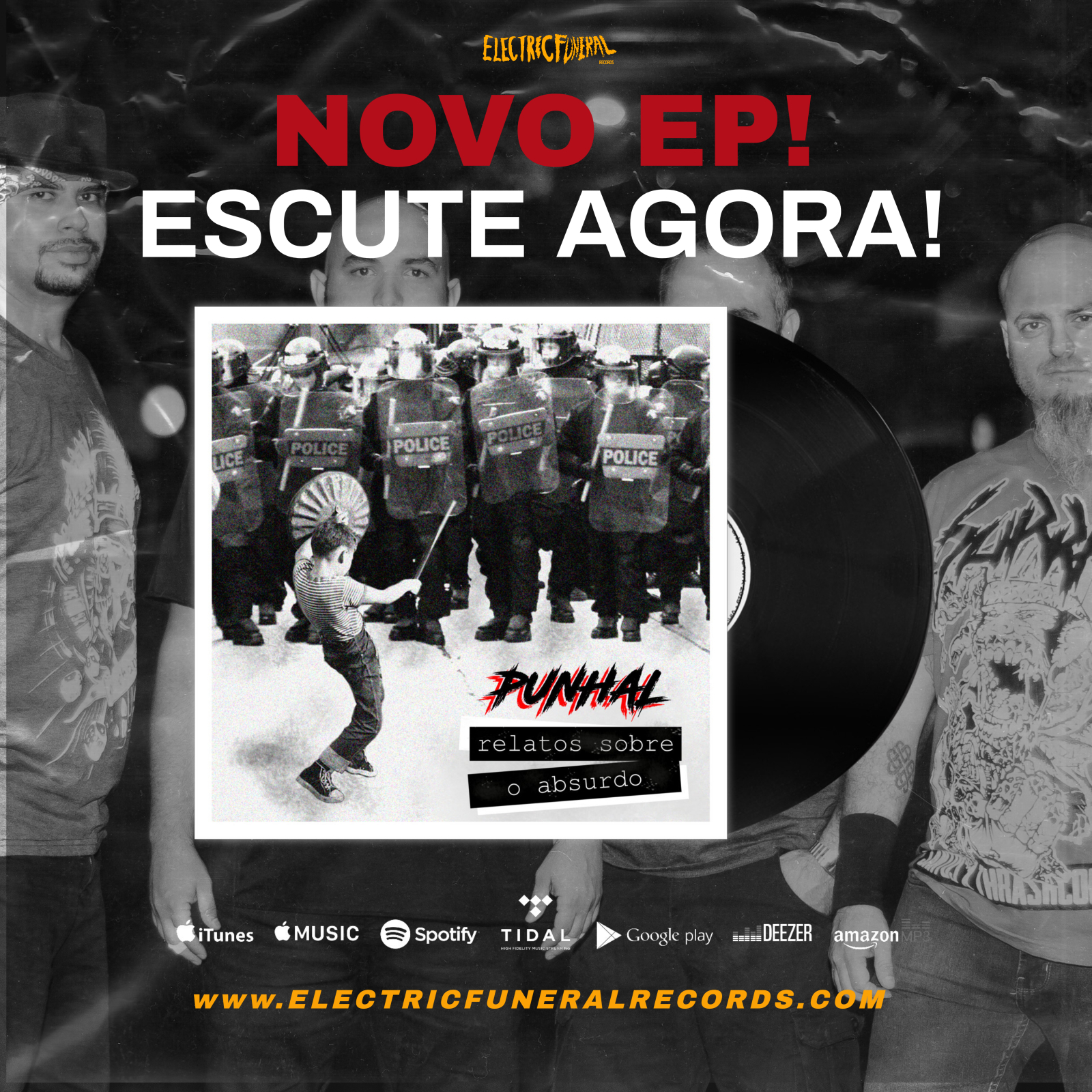 Depois de lançar seu primeiro álbum, Entropia, pelo selo latino-americano Electric Funeral Records, a Punhal, banda de punk/hardcore/crossover do subúrbio do Rio de Janeiro, relança seu primeiro registro fonográfico, o EP “Relatos sobre o Absurdo“, pelo mesmo selo. Lançado originalmente em 14 de julho de 2019, data do primeiro show ao vivo da banda, o EP conta com 4 faixas (2 destas também presentes no álbum Entropia) e retrata os absurdos que o povo brasileiro tem vivenciado com a ascensão do pensamento e comportamento neofascista em nosso país.