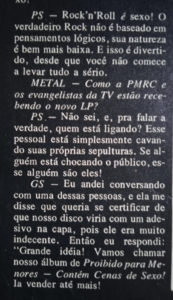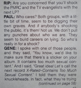 Mas o que isso quer dizer? Que você pode falar o que quiser, mas que você não sairia ileso com isso. Uma comissão de pais se uniria pra anotar todos os pontos que achavam nocivos para os jovens em determinadas músicas, de determinadas bandas. Era uma proibição? Não. Mas era uma recomendação! Mas o rock é rebelde, o adolescente é rebelde e a sociedade ama o que não pode ou ano deve ser consumido. Logo, o tiro saiu pela culatra e todos os álbuns em que o selo “Parental Advisory” e “PMRC” apareciam, dobraram e até triplicaram suas vendas. Em entrevista para a Rip Magazine, em 1987, Gene Simmons, o linguarudo, baixista e co-fundador da instituição Kiss, confirma essa informação, o que foi um tapa na cara da comissão. Essa mesma entrevista foi traduzida para a Revista Metal, também de 1987.