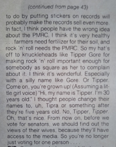 Estilo consolidado, ídolos surgindo aos montes, Elvis, Beatles, Kiss… já era hora de criar sub-estilos e a partir daqui, já não importava mais o que você ia falar, ou como você iria se vestir, desde que você nao cometesse qualquer crime, ok. Depois da primeira etapa de politização da galera do rock, eles sabiam estar protegidos pela primeira emenda, que garantia sua liberdade de expressão. O que não impediu os conservadores, em 1985, capitaneados por Tippy Gore, esposa do então senador Al Gore a pedir pela criação do PMRC (Parental Music Resource Center).