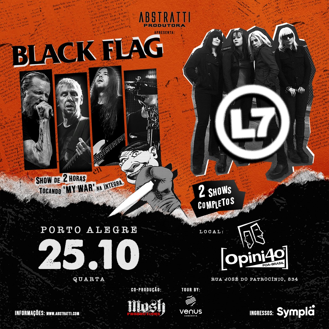Dois grandes nomes do rock no passado juntam-se no presente para provar que o gênero musical ainda tem futuro. O encontro rola em Porto Alegre nesta quarta-feira (25), no Opinião (José do Patrocínio, 834), às 19h, quando Black Flag e L7, ambas as bandas da Califórnia (Estados Unidos), dividem uma noite que tende a ser histórica. O grupo liderado pelo guitarrista Greg Ginn, e apontado como pioneiro do hardcore nos anos 1980, desembarca pela primeira vez na capital gaúcha. O repertório inclui o segundo álbum “My War” na íntegra e mais temas de outras fases da carreira — em show com mais de duas horas. Já o quarteto feminino, geralmente relacionado ao movimento grunge, chega ao Rio Grande do Sul para sua segunda apresentação, trazendo na bagagem a atitude que as consagrou desde os 1990 em performance com clássicos de toda a carreira.