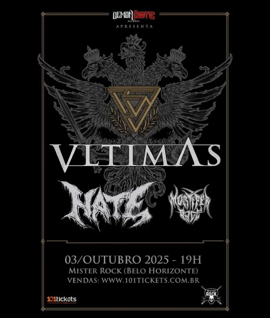 Na última sexta-feira, 03 de outubro, Belo Horizonte viveu uma noite histórica. A turnê conjunta de Hate e Vltimas desembarcou no Mister Rock sob a produção impecável da Demoncratic Records, que mostrou mais uma vez como se organiza um espetáculo extremo com profissionalismo: horários respeitados, sonorização limpa e brutal, e uma atmosfera que fez justiça à grandeza das bandas.