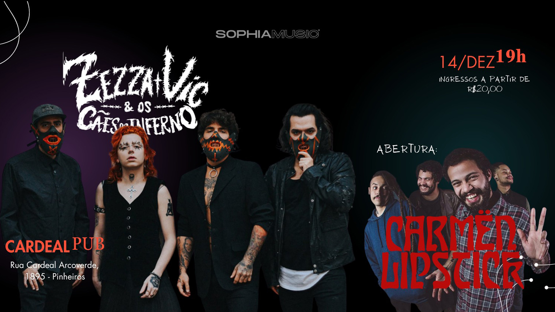 Ingressos: www.sympla.com.br/evento/sophiamusic-apresenta-zezza-vic-e-os-caes-do-inferno-carmen-lipstick-no-cardeal-pub/2253090