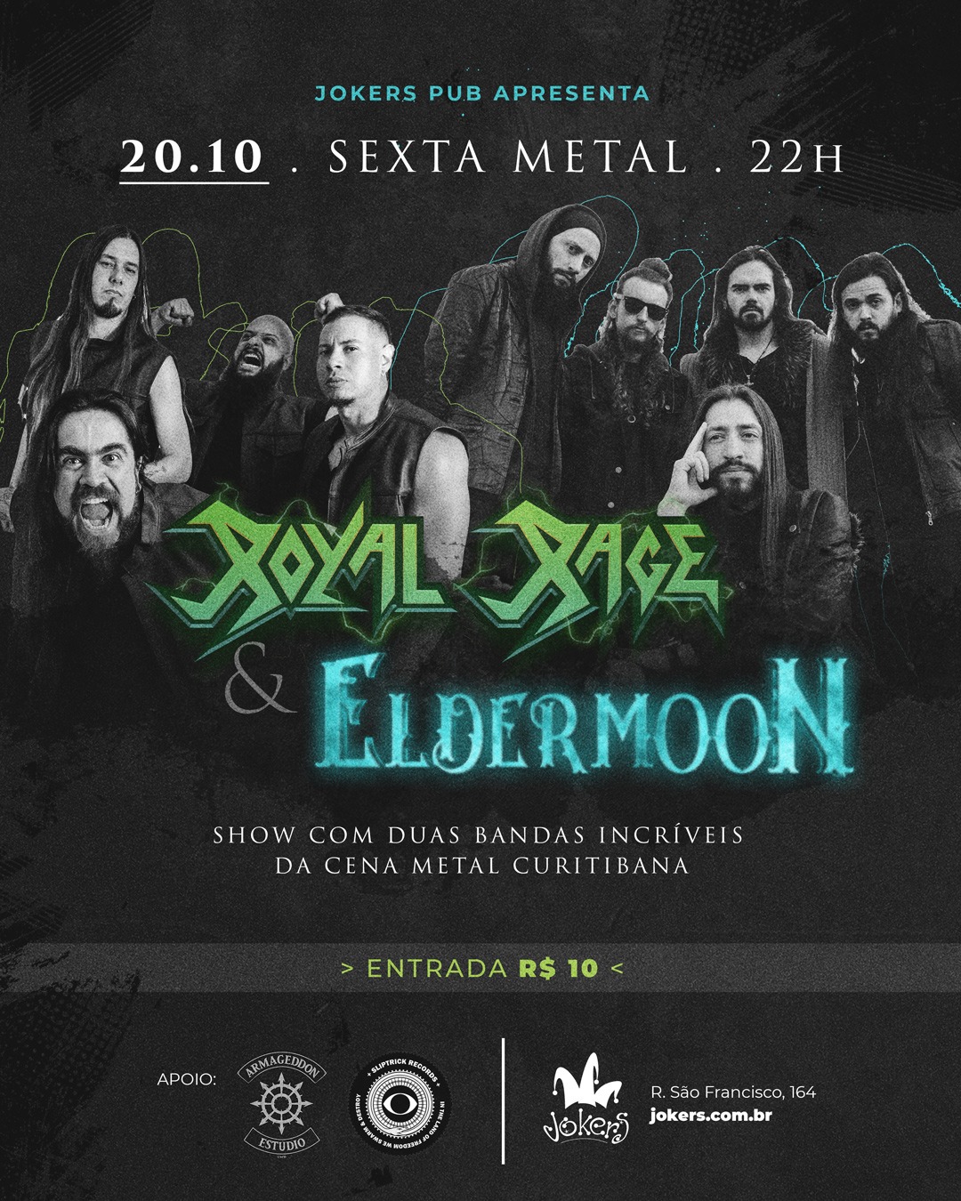 Prestes a embarcar para sua primeira turnê internacional, o ROYAL RAGE segue fazendo shows em sua terra natal e anuncia show no próximo dia 20/10 em Curitiba ao lado do Eldermoon. O evento será realizado no Jokers Pub, localizado na R. São Francisco, 164 – Centro. Com abertura da casa prevista para às 18h e shows às 20h e ingressos custando apenas R$ 10,00, o ROYAL RAGE promete dar uma amostra de como serão os shows que os europeus assistirão: “Estamos esquentando os motores para a turnê e a cada apresentação que fazemos aqui temos a certeza de que o público europeu irá curtir cada minuto com a gente. O repertório será baseado em nosso novo álbum, “Evolve”, e dentre as faixas do petardo está “Lampião”, destaque absoluto nos palcos”. Nesta apresentação a banda dará início à uma pré-venda exclusiva da camiseta da turnê europeia, e será a única chance de adquirir este modelo aqui no Brasil.