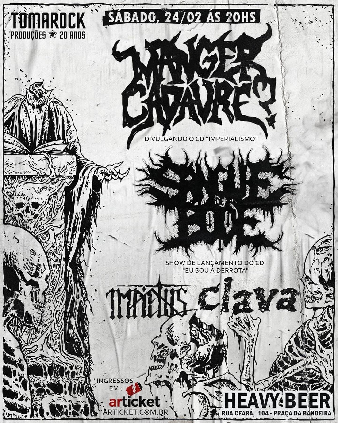 Piadas a parte, no sábado passado, a Tomarock Produções trouxe para mais uma apresentação na cidade, os Paulistanos do Manger Cadavre? e o pessoal do Sangue de Bode, que estão com discos incríveis na pista, o pessoal do Clava e o Impietus e fomos lá conferir e já quero começar essa cobertura, parabenizando e muito o cenário carioca, que chegou junto em peso no evento, com um atendimento muito bom de público, outra coisa que é necessário se destacar é o nível de produção e pontualidade no qual a Tomarock Produções entrega, tudo funciona conforme o noticiado, perfeito!!