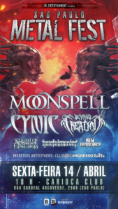 O São Paulo Metal Fest apresenta um poderoso e diferenciado lineup com bandas do alto escalão da música pesada do Brasil e do mundo. No dia 14 de abril (sexta-feira), a partir das 18h, o Carioca Club, na capital paulista, será palco para seis bandas: Moonspell (Portugal), Cynic (Estados Unidos), Beyond Creation (Canadá), Weight of Emptiness (Chile), Hatefulmurder e New Democracy (Brasil). A realização e produção é da IDL Entertainment.