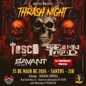 Sábado (25), em Santos, a “Thrash Night” contará com as bandas Savant, Tosco e Siegrid Ingrid, no Banana Lounge (antigo Valongo Bar) que fica na Rua São Bento, 43, e começa a partir das 21h. Ingressos antecipados, R$30.
