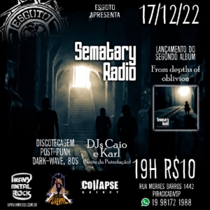 O evento de lançamento ocorrerá no Esgoto Bar em Piracicaba-SP, local já reconhecido na cena underground do interior paulista, com apresentação da Sematary Radio às 20 horas e após a banda, a noite se estenderá com discotecagem post-punk/dark-wave/synth-wave com os DJs Caio e Karl, produtores do evento “Noite da Putrefação“.
