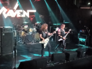 Os Gallagher que não brigam tomam controle do palco logo a seguir. John Gallagher (vocal e baixo), Mark Gallagher (guitarra) e Mike Heller (bateria), sabendo do entusiasmo dos fãs, principalmente o pessoal mais da velha guarda, fazem até paradinha em “Hell Patrol” só para o público continuar. Com imensa alegria no palco, um curioso contraste com os corpse paints ou iluminação completamente rubra de algumas bandas anteriores, os dois irmãos, a despeito da idade, parecem duas crianças encantadas com um brinquedo novo, brincam, esfregam os instrumentos um no outro… o encanto é o mesmo entre os expectadores, que gritam “Raven”, “Raven”, “Raven”. John arrasa nos agudos em “The Power“, do “Metal City“, o álbum mais recente. Ele também não perde a oportunidade de zoar o baterista, bem mais novo que os dois irmãos. A propósito, Mike Heller também é baterista da FEAR FACTORY e, só para vocês terem uma ideia, nasceu no ano seguinte ao primeiro álbum “Rock Until You Drop“. E por falar nisso, claro que a canção de mesmo nome não poderia faltar. E digo de novo, John não economiza nos agudos. Aqui não tem playback não, rapaz. “Depois dessa bosta de pandemia é bom fazer um pouco de rock and roll”, diz ele. E “On and On” é rock and roll, é Heavy Metal por quem gosta de Heavy Metal para quem gosta de Heavy Metal. Mas o que é bom dura pouco. E nesse caso foi pouco demais. Depois de “Break the Chain“, com um pouco de “Iron Man” do BLACK SABBATH e “Long Way to the Top“, do AC/DC, vem “Wiped Out” com “a versão mais rápida que vocês já ouviram”, como disse John.