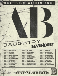 Para coincidir com o anúncio do novo álbum, o ALTER BRIDGE parte para a turnê “What Lies Within”, uma extensa tour europeia de 31 datas, começando em 15 de janeiro de 2026 na Alemanha e encerrando em 5 de março em Nottingham (Reino Unido). Mais informações sobre ingressos e pacotes VIP estão disponíveis em www.alterbridge.com.