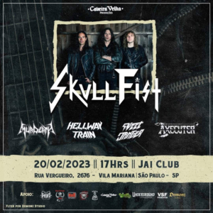 A Caveira Velha Produções preparou uma segunda-feira de Carnaval do jeito que todo o fã de heavy metal gosta: com um show! No dia 20 de fevereiro, a partir das 17h, o Jai Club (SP) receberá os canadenses do Skull Fist, que atualmente promovem o álbum “Paid in Full” (2022). O evento ainda contará com a presença das bandas Murdeath (PR), Axecuter (PR), Hellway Train (MG) e Sweet Danger (SP).