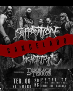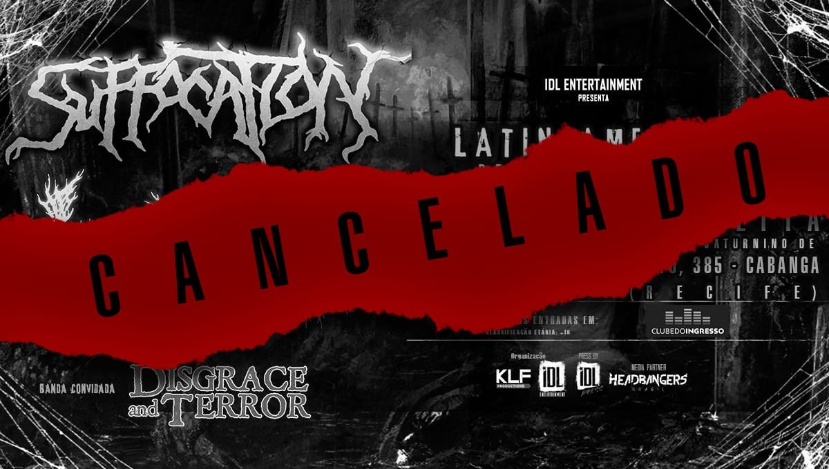 “É com grande pesar que anunciamos o cancelamento da data de Recife. Suffocation e Incantation fariam um show junto aos monstros do Disgrace And Terror no Estelita, mas devido a problemas de logística a chegada das bandas se tornou inviável. Nossos parceiros e irmãos da COI assumiram a data e o show acontece em Limeira no dia 6 de setembro, seguido de São Paulo dia 7, Curitiba dia 8 e Porto Alegre dia 9“, informa Pedro Kaluf, da KLF Productions. “Um comunicado foi enviado pelo Clube Do Ingresso com as informações sobre a devolução dos ingressos“, completa.