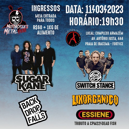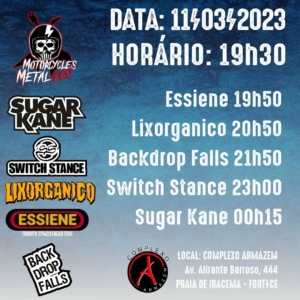 A banda paranaense SUGAR KANE chega novamente à Fortaleza com a Tour Continuidade da Máquina 20 Anos, comemorando as duas décadas de lançamento do álbum com o mesmo nome (mas mais conhecido pelos fãs simplesmente como Continuidade). E no show deste sábado, no Motorcycles Metal Fest, no Complexo Armazém ela vai estar acompanhada pela icônica Switch Stance, além das bandas ESSIENE, BACKDROP FALLS e LIXORGANICO.