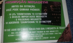 Se lá fora “Countdown to Extinction” foi um sucesso, aqui não foi nada diferente. Os clipes foram bem divulgados pela MTV Brasil no programa Furia Metal e na programação normal também. As radio rock receberam bem músicas como “Symphony of Destruction” e “Foreclosure of a Dream“. A EMI lançou o trabalho nos formatos LP, K7 e CD. Comprei minha cópia, um CD, na loja Aqualung, na Galeria do Rock, em 3 de agosto de 1992. Várias promoções, anúncios e concursos foram veiculados em rádios, revistas especializadas como a Rock Brigade e até um conhecido fanzine carioca chamado Backstage, que estava na transformação para se tornar uma revista. A chamada no anúncio era assim: “Acabou a Eco 92! Começou a contagem regressiva para a extinção”. Vale dizer para quem não lembra ou nem sabe o que foi: A Conferência das Nações Unidas sobre o Meio Ambiente e o Desenvolvimento, batizada como Eco-92, foi uma reunião de chefes de estado organizada pelas Nações Unidas e realizada de 3 a 14 de junho de 1992 na cidade do Rio de Janeiro. Seu objetivo foi debater os problemas ambientais mundiais.