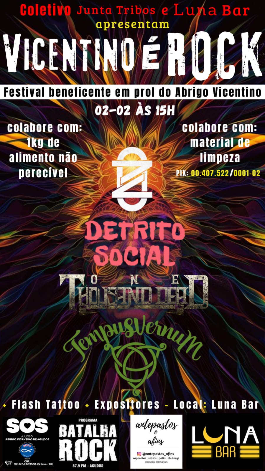 A banda TEMPUSVERNUM será uma das atrações do festival beneficente “Vicentino é Rock”, que acontecerá no próximo dia 2 de fevereiro, domingo, a partir das 15h, no Luna Bar Confraria de Ideias, na cidade de Agudos, interior de São Paulo. O evento, promovido pelo Coletivo Junta Tribos, tem como objetivo arrecadar doações de alimentos não perecíveis e materiais de limpeza em prol do Abrigo Vicentino de Agudos. O festival reunirá também outras bandas do cenário Rock/Metal, como Detrito Social e One Thousand Dead, garantindo uma tarde repleta de música pesada e solidariedade. Além das apresentações musicais, o público poderá aproveitar flash tattoos, exposições e produtos artesanais de expositores locais.