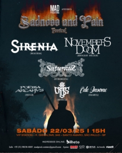 O ‘Sadness and Pain Festival’ reunirá esses três gigantes do gênero no VIP Station. Mas não é só isso: o evento também contará com a presença dos paraibanos do Ode Insone e dos chilenos do Poema Arcanus. Confira abaixo o cartaz e o serviço completo para mais informações: