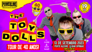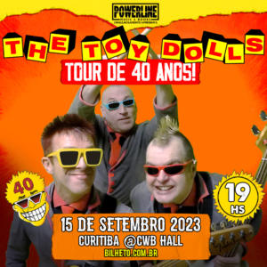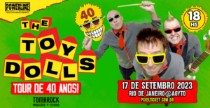 Reconhecida mundialmente há mais de quatro décadas como uma banda de letras bem-humoradas, não raramente em tom de deboche, e com um dos instrumentais mais enérgicos do cenário punk rock, o The Toy Dolls está de volta ao Brasil em setembro de 2023 com a turnê que celebra 40 anos de história. Serão quatro apresentações, com realização da Powerline Music & Books, a mesma produtora que promoveu o giro do trio em 2018: Porto Alegre (13/09, Bar Opinião), Curitiba (15/09, CWB Hall), São Paulo (16/09, Carioca Club) e Rio de Janeiro (17/09, Agyto).