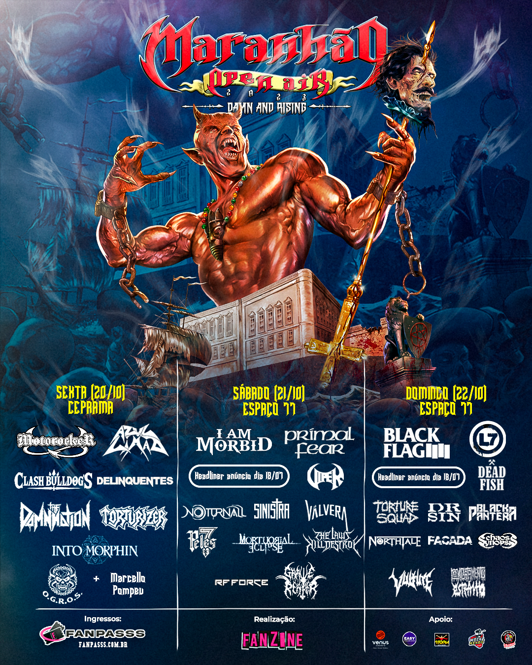 Para começar o segundo semestre com tudo, o TORTURIZER acaba de anunciar que estará presente no maior festival de Metal do nordeste brasileiro. Isso mesmo, a banda confirmou presença no ‘Maranhão Open Air 2023’, que acontecerá nos dias 20, 21 e 22 de outubro. O quarteto se apresentará na sexta-feira (20), ao lado de Motorocker, Azul Limão, Clash Bulldogs, Delinquentes, The Damnation, Into Morphin e O.G.R.O.S. + Marcello Pompeu, confira abaixo o cartaz e serviço completo para mais informações: