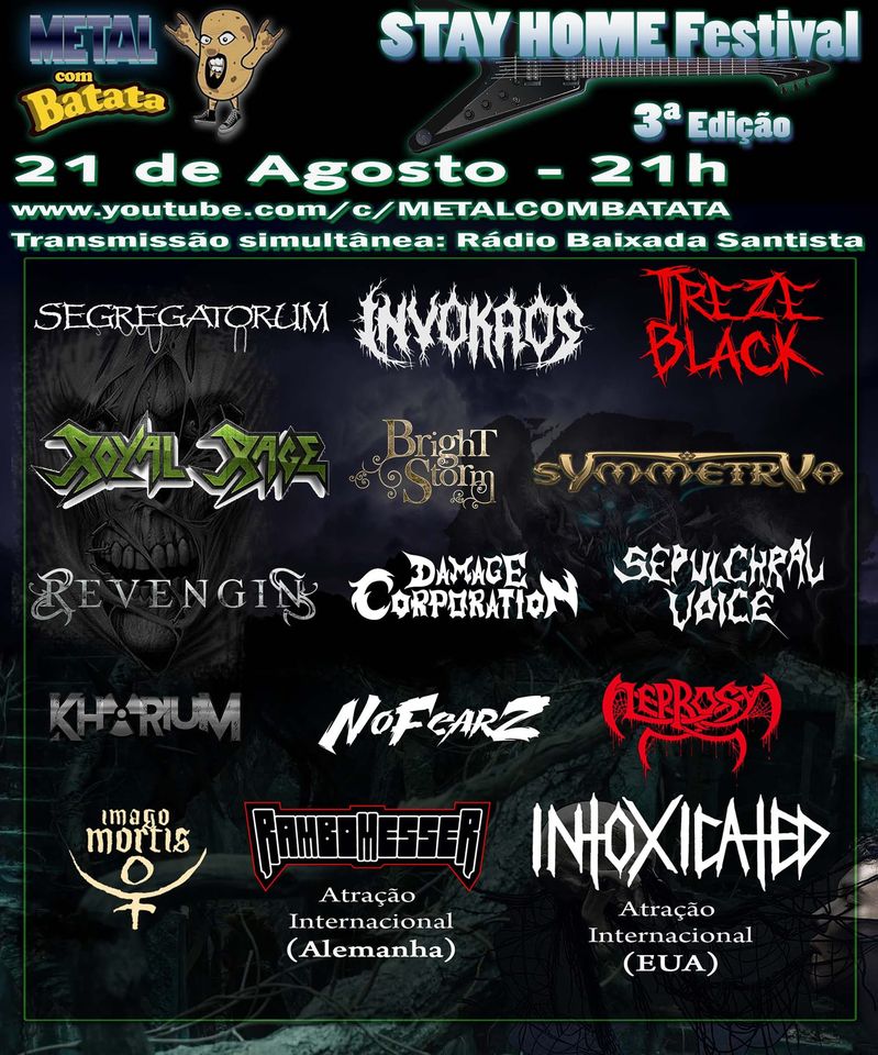 A banda gaúcha TREZE BLACK, de Caçapava do Sul/RS, participará de dois festivais online nos próximos dias, nos canais do Heavy Talk e do programa Metal com Batata. O primeiro evento será nesta sexta-feira, 21/08, na terceira edição do Metal com Batata Stay Home Festival, ao lado das bandas Royal Rage, Invokaos, Symmetrya, Bright Storm, Overdose Nuclear, Revengin, Damage Corporation, Sepulchral Voice, Khorium, NoFearz, Leprosy, Imago Mortis, RamboMesser (Alemanha) e Intoxicated (EUA). O festival será transmitido às 21h no canal do programa Metal com Batata, no seguinte link, https://www.youtube.com/channel/UCSyznur7yhUilZP_Dwwjzlw.