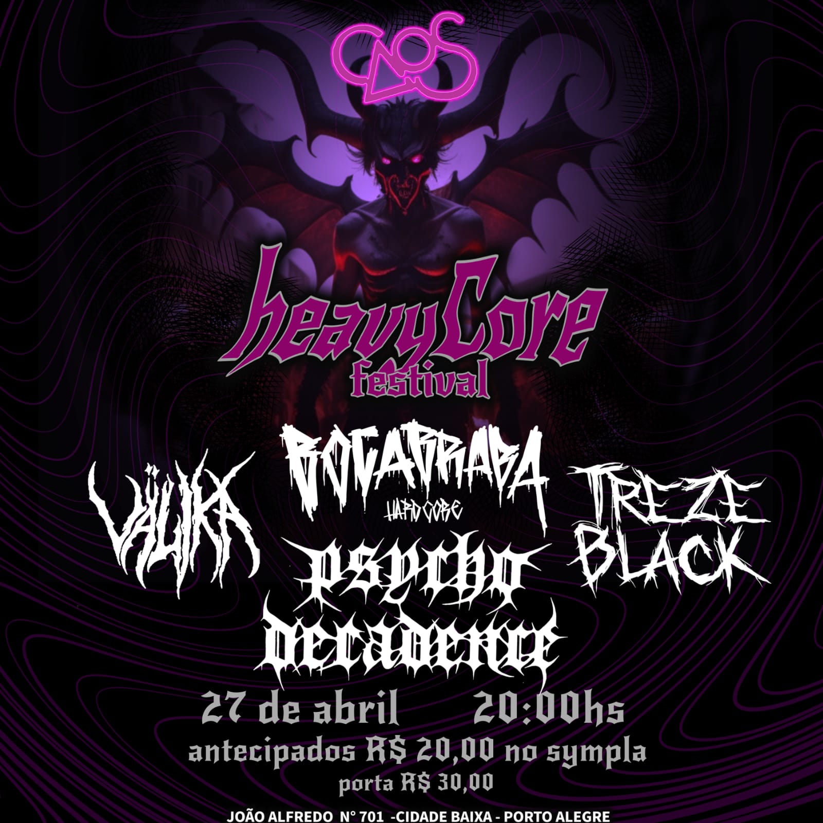 Neste sábado, 27, a banda TREZE BLACK voltará aos palcos da capital gaúcha para tocar no HEAVYCORE FESTIVAL, que será realizado no Caos Bar, localizado na João Alfredo, 701. O evento, que terá início às 20h, contará ainda com as bandas Boca Braba Hardcore, Valika e Psycho Decadence, com ingressos custando R$ 20,00 antecipados via Sympla e R$ 30,00 na hora. Este show faz parte de uma miniturnê que o TREZE BLACK, de Caçapava do Sul, vem fazendo pelo Estado, com novos shows sendo adicionados a agenda.