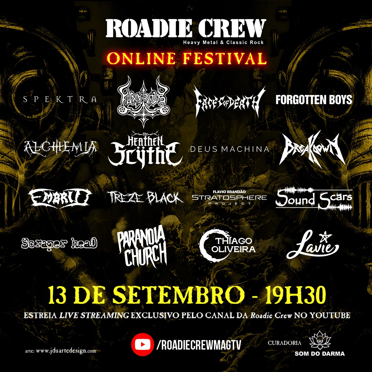 Nesta sexta-feira 13, a banda gaúcha TREZE BLACK participará da 54º edição do tradicional “Roadie Crew – Online Festival”, promovido pela revista ROADIE CREW e curadoria da SOM DO DARMA. Nesta edição, o TREZE BLACK dividirá as telas com as bandas Spektra, Funeratus, Faces of Death, Forgotten Boys, Alchemia, The Heathen Scythe, Flávio Brandão Stratosphere Project, Breakdown, Embrio, Deus Machina, Sound Scars, Scraper Head, Paranoia Church, Thiago Oliveira e Lavie. O evento, que será transmitido pelo canal da revista no YouTube, terá início às 19h30, no seguinte link: www.youtube.com/roadiecrewmagtv.