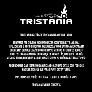 Caros amigos e fãs do Tristania na América Latina, informamos que a nova data da apresentação em São Paulo será 10 de dezembro de 2022. A própria banda assinou um pronunciamento coletivo:
