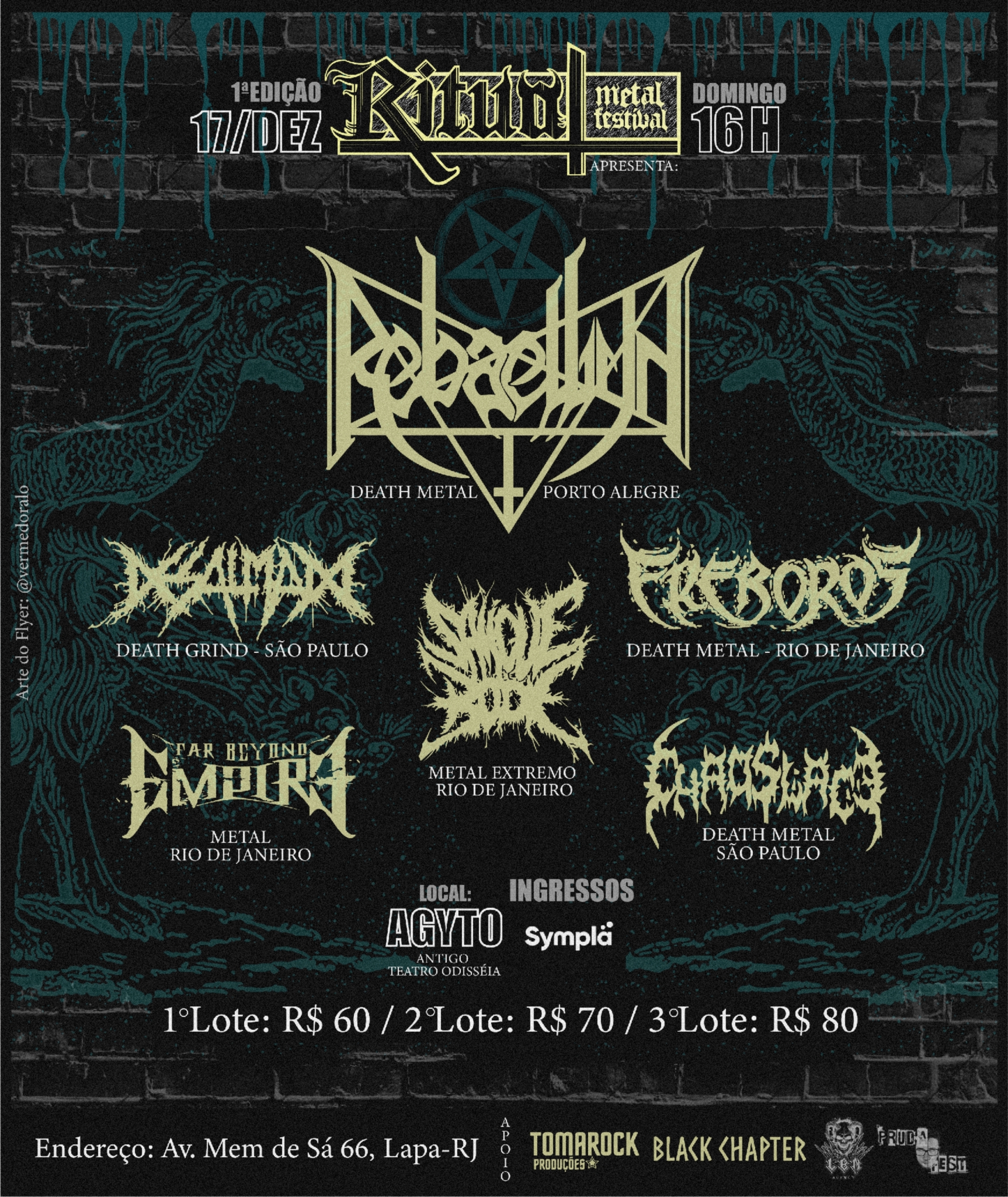 Em Dezembro, o Verão Carioca terá um dia completamente diferente, aonde o calor, o sol e clima da cidade se curvarão aos Deuses do Metal Extremo, um Ritual irá percorrer todo o estado, te convocando para um dia aonde não somente o Metal Nacional estará em festa, mas a faceta mais Extrema irá estar com a maior representação do cenário no Agyto, em um domingo voltado ao mais belo, pútrido e veloz Death Metal ativo no Brasil.