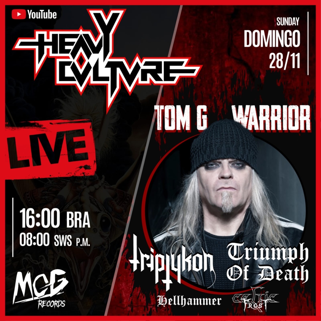 A agenda de novembro do HEAVY CULTURE segue no dia 28/11, domingo, às 16h, com a aguardada presença de Tom G. Warrior, fundador dos seminais Hellhammer e Celtic Frost, e que atualmente lidera o Triptykon e o Triumph of Death. No dia 30 será a vez de conversar com o guitarrista Craig Locicero, do gigante da Bay Area Forbidden.