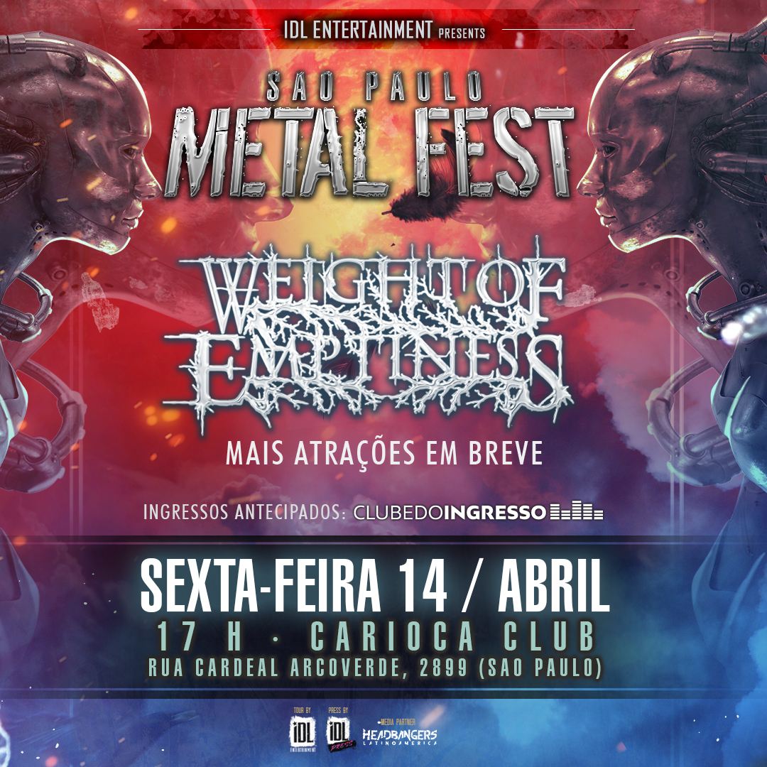 O São Paulo Metal Fest, que acontece dia 14 de abril, no Carioca Club (SP), tem mais uma atração internacional confirmada: a banda de death/doom metal Weight Of Emptiness, do Chile, que entra num já poderoso line-up ao lado de Moonspell (Portugal), Cynic (EUA) e Beyond Creation (Canadá). Mais duas atrações, agora bandas brasileiras, serão anunciadas.